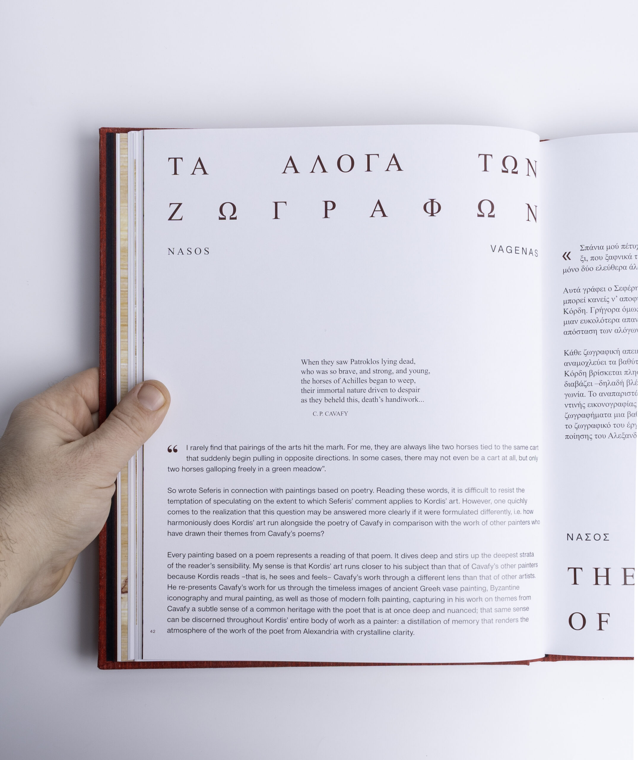 Κείμενα των Ευρυπίδη Γαραντούδη, Νάσου Βαγενά, Δημήτρη Κοσμόπουλου, Θανάση Σέμογλου, αντίστοιχα. «Τα ποιήματα του Καβάφη δεν τα διαβάζεις· τα ακούς και τα αισθάνεσαι και μέσα από αυτήν την α ί σ θ η σ ι βρίσκεις –όσο μπορεί ένας σημερινός άνθρωπος, στερημένος ύφους, να βρει– έναν κόσμο περασμένο, αλλά πάντα παρόντα μέσα από τη διαχρονικότητα των πόθων και των παθών της ανθρώπινης ψυχής. […] Προσπάθησα να πλησιάσω τα ποιήματά του και όχι την ποίησή του γενικά κι αόριστα. Έμεινα στα συγκεκριμένα χωρίς ερμηνευτική διάθεση κι έγραψα τις εικόνες που μου ήρθαν στη φαντασία διαβάζοντας τα ποιήματα. Έγραψα τις εικόνες που μου έφεραν τα ποιήματα με τρόπο λιτό και απλό ωσάν να γράφει κανείς σημειώσεις επάνω σε χαρτί· χωρίς αναπαραστατική διάθεση, χωρίς υπαινιγμό, σε μιαν άλλη εικονική πραγματικότητα. […] Απλώς έγραψα με έγχρωμα σχέδια τις εικόνες που μου έφερε στον νου», αναφέρει χαρακτηριστικά ο Γ. Κόρδης.