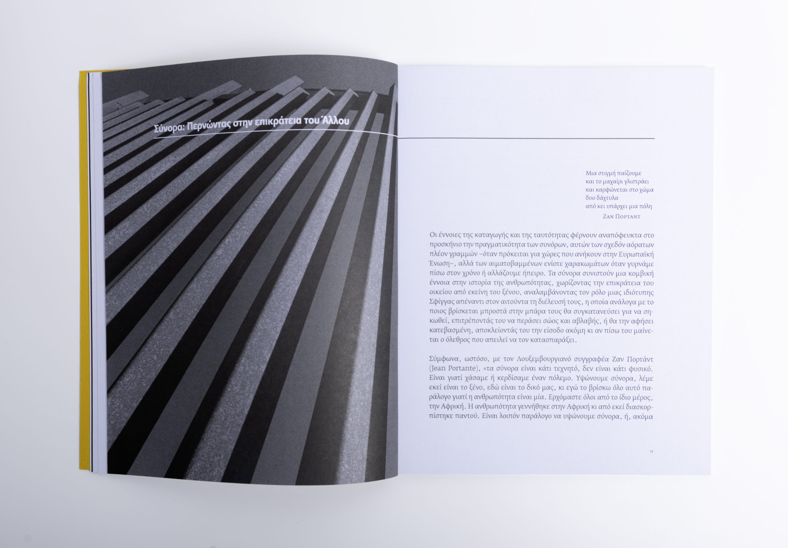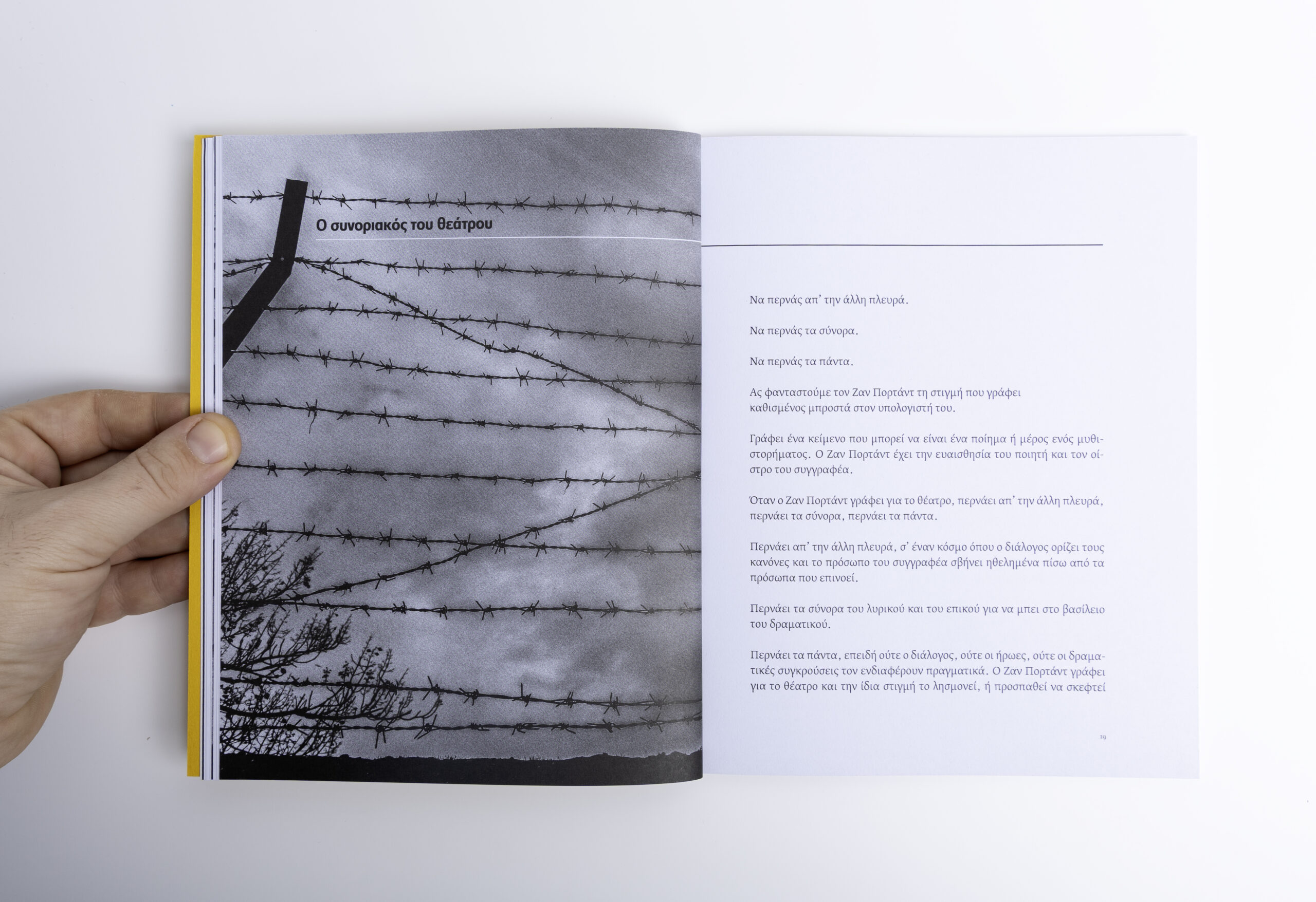 Ο θεατρικός και ταυτόχρονα ποιητικός μονόλογος του πολυβραβευμένου Λουξεμβουργιανού συγγραφέα Ζαν Πορτάντ ξεκινά σαν μια άκρως προσωπική εξομολόγηση, αλλά στην πορεία διασταυρώνεται με την ιστορία της ανθρωπότητας: «Τα σύνορα είναι κάτι τεχνητό, δεν είναι κάτι φυσικό. Είναι γιατί χάσαμε ή κερδίσαμε έναν πόλεμο. Υψώνουμε σύνορα, λέμε εκεί είναι το ξένο, εδώ είναι το δικό μας, κι εγώ το βρίσκω όλο αυτό παράλογο γιατί η ανθρωπότητα είναι μία». «Τα σύνορα τροφοδοτούν διαρκώς την αφήγηση και ζητούν από τη μνήμη να μιλήσει για τον ριζωμό και τον ξεριζωμό, τις πολλαπλές καταβολές αλλά και τις επίκτητες παραφυάδες, την ταυτότητα. […] Ο Πορτάντ γράφει ένα είδος οικογενειακής αυτοβιογραφίας στην οποία ωστόσο εγκιβωτίζει τις ανώνυμες βιογραφίες όλων των προσφύγων, απ’ όπου ξεχωρίζουν κάποιες προσωπικές μαρτυρίες, περνώντας διαρκώς από το φανταστικό στο πραγματικό και τανάπαλιν, δημιουργώντας έναν ιστό σκέψεων και συναισθημάτων που αιχμαλωτίζουν τον αναγνώστη», αναφέρει η Μαρία Παπαδήμα στο εισαγωγικό της σημείωμα.