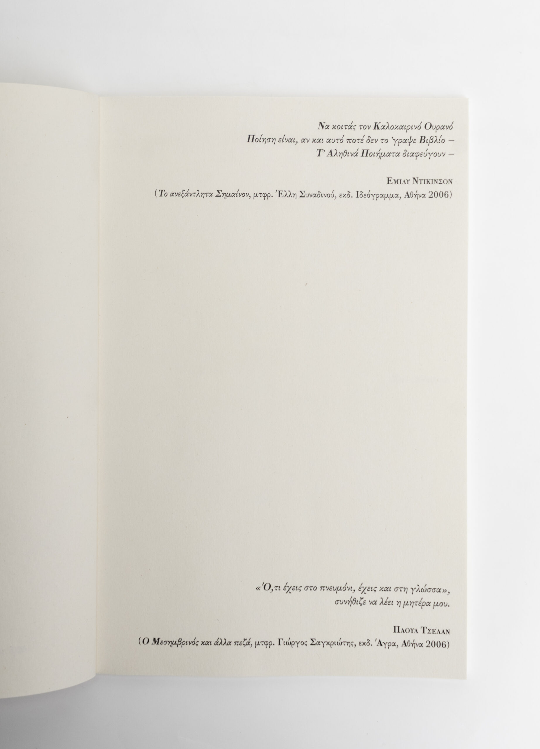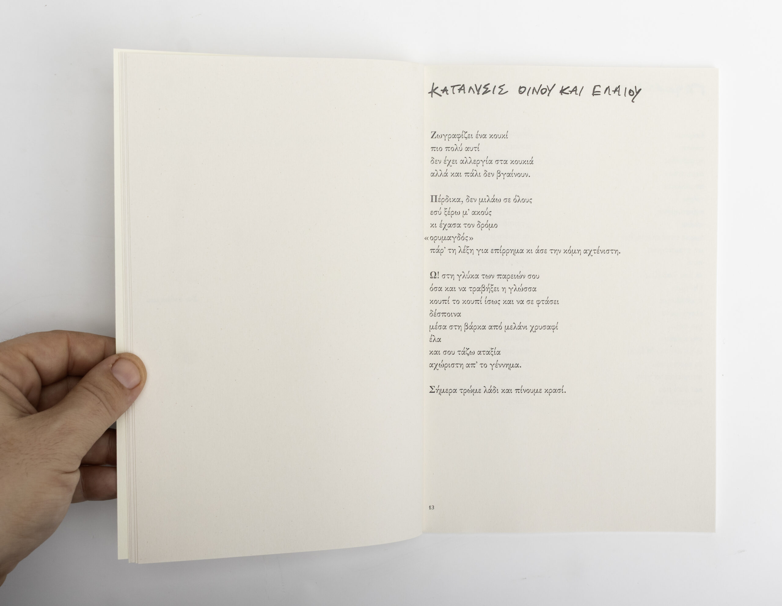 Ανήμερα της παραμονής, κατάλυσις οίνου και ελαίου. Η γιορτή του ποιητή λιτανεύει και πιάνει απ’ τα μούτρα το κέντρο της πόλης. Άνθρωποι-σπηλιές φοράνε τα βιβλία σαν γάντια και βγαίνουν να θάψουν διαμάντια, αποφεύγουν τα 2Κ, 4Λ, 6Μ, πετάνε τις κουρτίνες στους μπλε κάδους, τρώνε σούπα με γίδα, ηχογραφούν τις φωνές τους, επιστρέφουν στα σπίτια τους με μαλλιά εξαντλημένα για να βρουν σάλια στα χαλιά, ντύνονται οστά, καταπίνουν τη σκιά χωρίς να πνίγονται, και χώνονται κάτω από τα κρεβάτια, αφού έχουν οπωσδήποτε προηγουμένως βάλει ΒΙΚΣ ΣΤΗ ΜΥΤΗ.